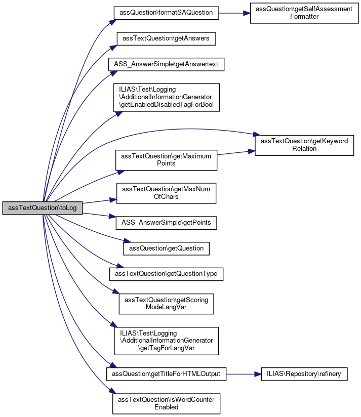 Here is the call graph for this function:| assTextQuestion::toLog | ( | AdditionalInformationGenerator | $additional_info | ) |