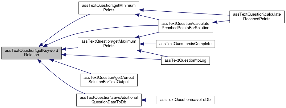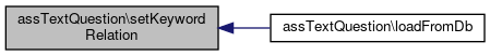 Here is the call graph for this function:| assTextQuestion::setKeywordRelation | ( | ?string | $relation | ) |