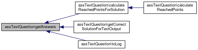Here is the call graph for this function:| array assTextQuestion::$answers = [] |