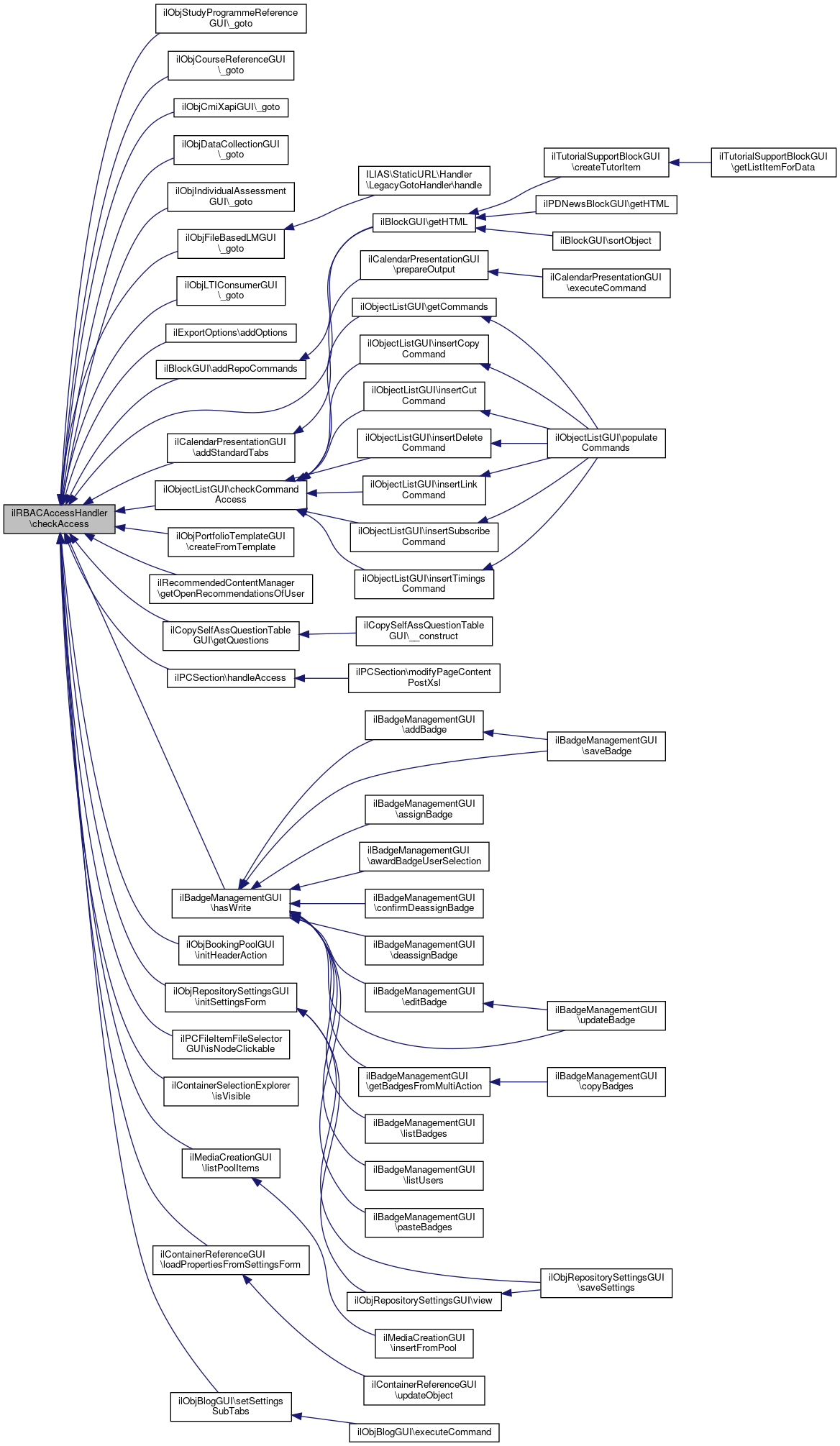 Referenced by ilObjStudyProgrammeReferenceGUI\_goto(), ilObjCourseReferenceGUI\_goto(), ilObjCmiXapiGUI\_goto(), ilObjDataCollectionGUI\_goto(), ilObjIndividualAssessmentGUI\_goto(), ilObjFileBasedLMGUI\_goto(), ilObjLTIConsumerGUI\_goto(), ilExportOptions\addOptions(), ilBlockGUI\addRepoCommands(), ilCalendarPresentationGUI\addStandardTabs(), ilObjectListGUI\checkCommandAccess(), ilObjPortfolioTemplateGUI\createFromTemplate(), ilBlockGUI\getHTML(), ilRecommendedContentManager\getOpenRecommendationsOfUser(), ilCopySelfAssQuestionTableGUI\getQuestions(), ilPCSection\handleAccess(), ilBadgeManagementGUI\hasWrite(), ilObjBookingPoolGUI\initHeaderAction(), ilObjRepositorySettingsGUI\initSettingsForm(), ilPCFileItemFileSelectorGUI\isNodeClickable(), ilContainerSelectionExplorer\isVisible(), ilMediaCreationGUI\listPoolItems(), ilContainerReferenceGUI\loadPropertiesFromSettingsForm(), and ilObjBlogGUI\setSettingsSubTabs().