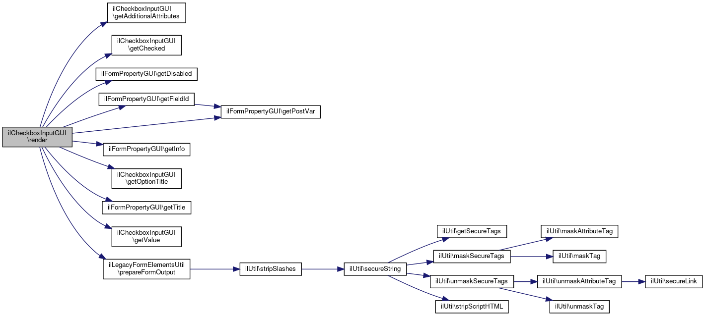 Here is the call graph for this function:| ilCheckboxInputGUI::render | ( | $a_mode = '' | ) |