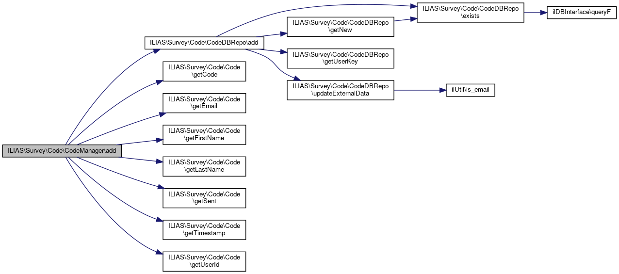 References ILIAS\Survey\Code\CodeManager\$code_repo, ILIAS\Survey\Code\CodeDBRepo\add(), ILIAS\Survey\Code\Code\getCode(), ILIAS\Survey\Code\Code\getEmail(), ILIAS\Survey\Code\Code\getFirstName(), ILIAS\Survey\Code\Code\getLastName(), ILIAS\Survey\Code\Code\getSent(), ILIAS\Survey\Code\Code\getTimestamp(), and ILIAS\Survey\Code\Code\getUserId().