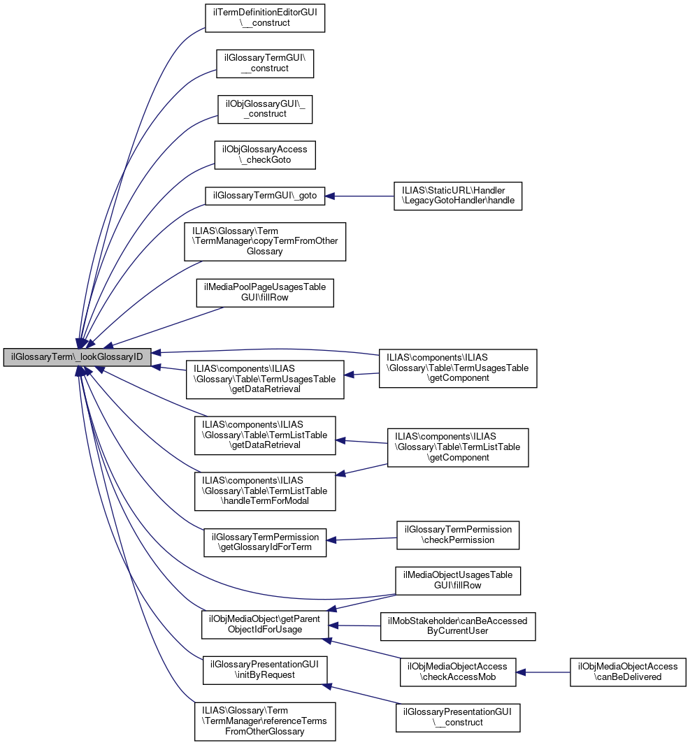 Referenced by ilTermDefinitionEditorGUI\__construct(), ilGlossaryTermGUI\__construct(), ilObjGlossaryGUI\__construct(), ilObjGlossaryAccess\_checkGoto(), ilGlossaryTermGUI\_goto(), ILIAS\Glossary\Term\TermManager\copyTermFromOtherGlossary(), ilMediaPoolPageUsagesTableGUI\fillRow(), ilMediaObjectUsagesTableGUI\fillRow(), ILIAS\components\ILIAS\Glossary\Table\TermUsagesTable\getComponent(), ILIAS\components\ILIAS\Glossary\Table\TermUsagesTable\getDataRetrieval(), ILIAS\components\ILIAS\Glossary\Table\TermListTable\getDataRetrieval(), ilGlossaryTermPermission\getGlossaryIdForTerm(), ilObjMediaObject\getParentObjectIdForUsage(), ILIAS\components\ILIAS\Glossary\Table\TermListTable\handleTermForModal(), ilGlossaryPresentationGUI\initByRequest(), and ILIAS\Glossary\Term\TermManager\referenceTermsFromOtherGlossary().