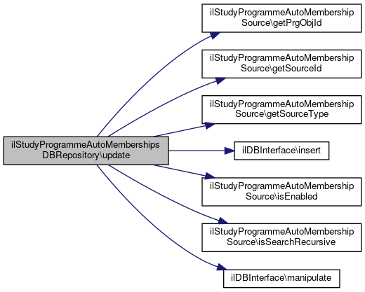 Here is the call graph for this function:| ilStudyProgrammeAutoMembershipsDBRepository::update | ( | ilStudyProgrammeAutoMembershipSource | $ams | ) |