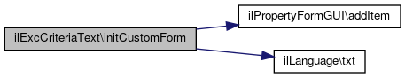 Here is the call graph for this function:| ilExcCriteriaText::initCustomForm | ( | ilPropertyFormGUI | $a_form | ) |