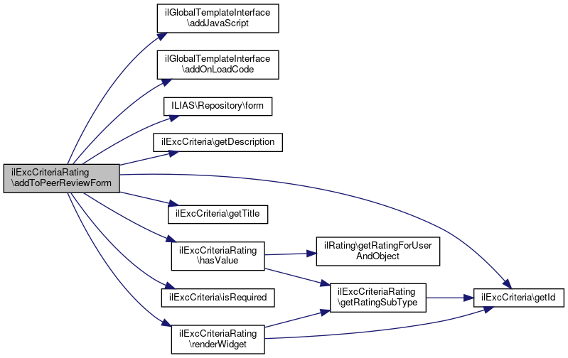 Here is the call graph for this function:| ilExcCriteriaRating::addToPeerReviewForm | ( | $a_value = null | ) |