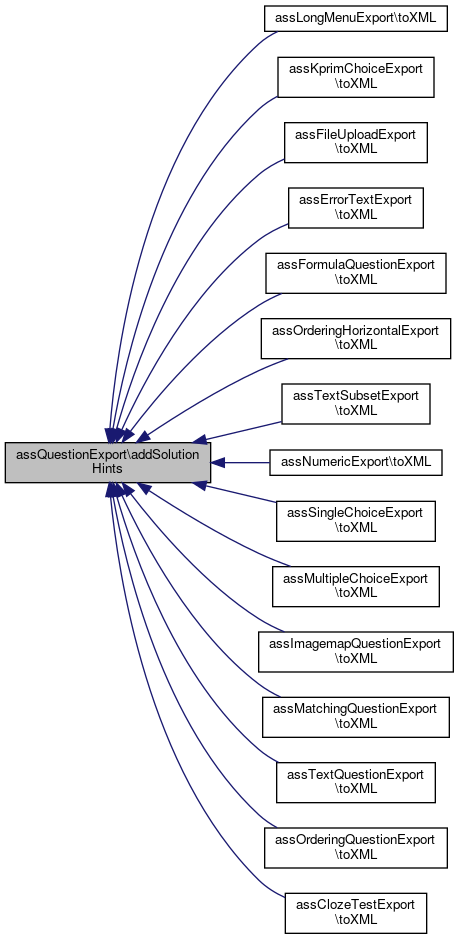 Here is the caller graph for this function:| assQuestionExport::toXML | ( | $a_include_header = true, |