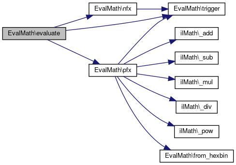 Here is the call graph for this function:| EvalMath::evaluate | ( | string | $expr | ) |