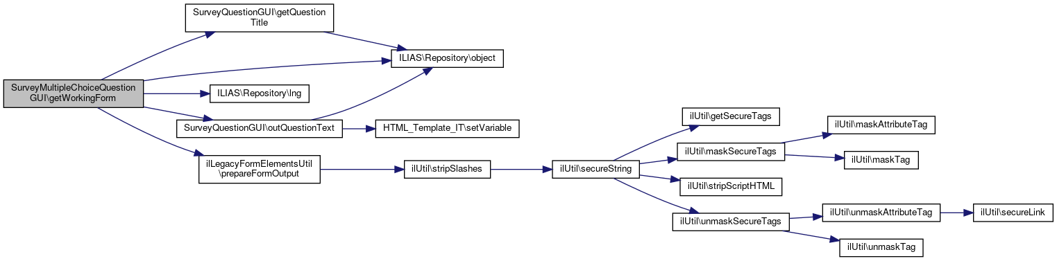 Here is the call graph for this function:| SurveyMultipleChoiceQuestionGUI::getWorkingForm | ( | array | $working_data = null, |