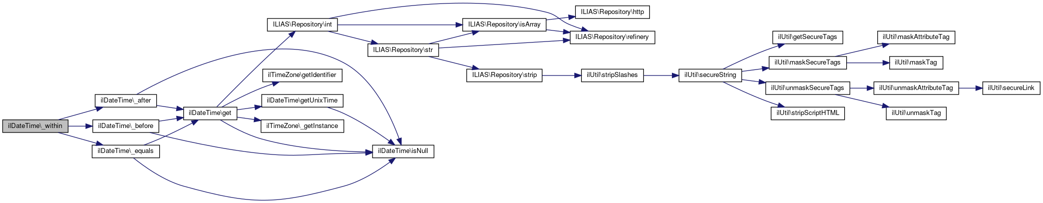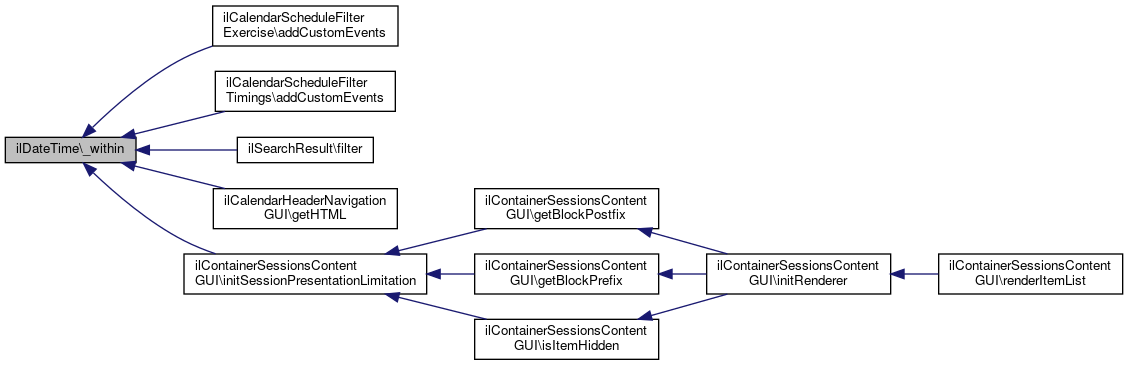 Referenced by ilObjGroupAccess\_registrationEnabled(), _within(), ilCalendarRecurrenceCalculator\applyDurationPeriod(), ilCalendarRecurrenceCalculator\applyLimits(), ilCalendarRecurrenceCalculator\calculateDateList(), ilDateDurationInputGUI\checkInput(), ilAppointmentPresentationConsultationHoursGUI\collectPropertiesAndActions(), ilCourseRegistrationGUI\fillRegistrationPeriod(), ilGroupRegistrationGUI\fillRegistrationPeriod(), ilConsultationHourBookingTableGUI\fillRow(), ilSearchResult\filter(), ilSessionClassificationPathGUI\findSessionContainerForItem(), ilPageObject\getActive(), ilCalendarAppointmentPanelGUI\getHTML(), ilCalendarAgendaListGUI\getHTML(), ilContainerSessionsContentGUI\initSessionPresentationLimitation(), ilBookingEntry\isAppointmentBookableForUser(), ILIAS\Calendar\ConsultationHours\BookingDataProvider\isFiltered(), ilECSCategoryMappingRule\matchesValue(), ilObjGroup\register(), ilCourseContentGUI\updateManagedTimings(), ilCourseContentGUI\updatePersonalTimings(), and ilECSCategoryMappingRule\validate().