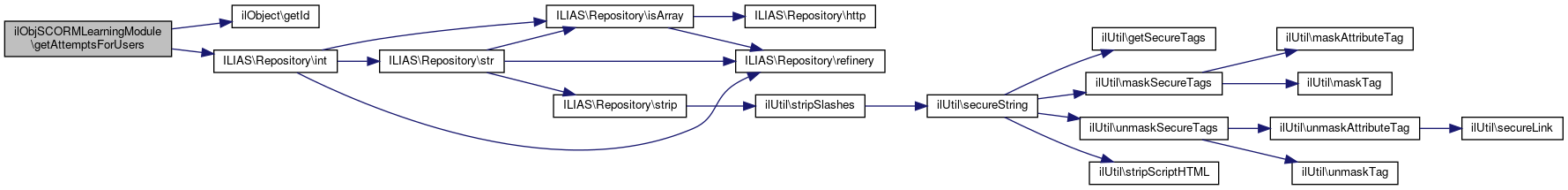 Here is the call graph for this function:| ilObjSCORMLearningModule::getAttemptsForUsers | ( | ) |
