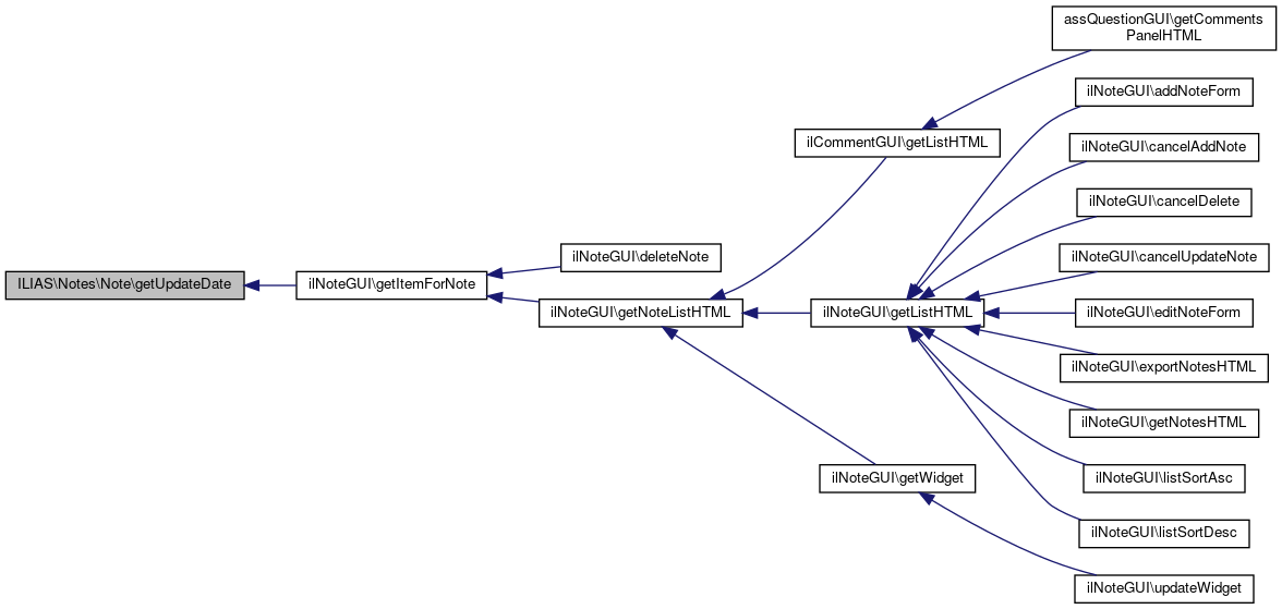 Here is the caller graph for this function:| ILIAS\Notes\Note::getUpdateDate | ( | ) |