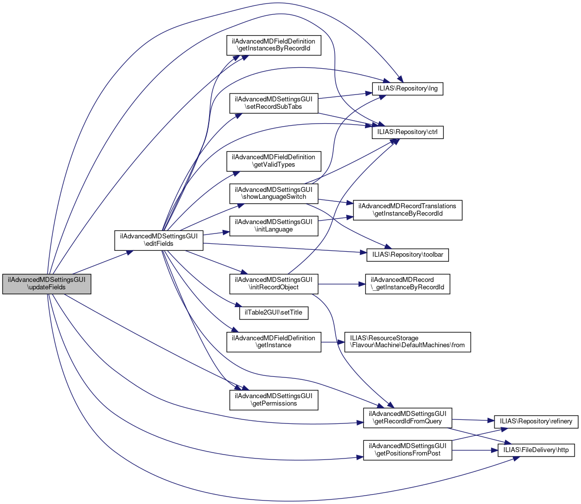 Here is the call graph for this function:| ilAdvancedMDSettingsGUI::updateFields | ( | ) |