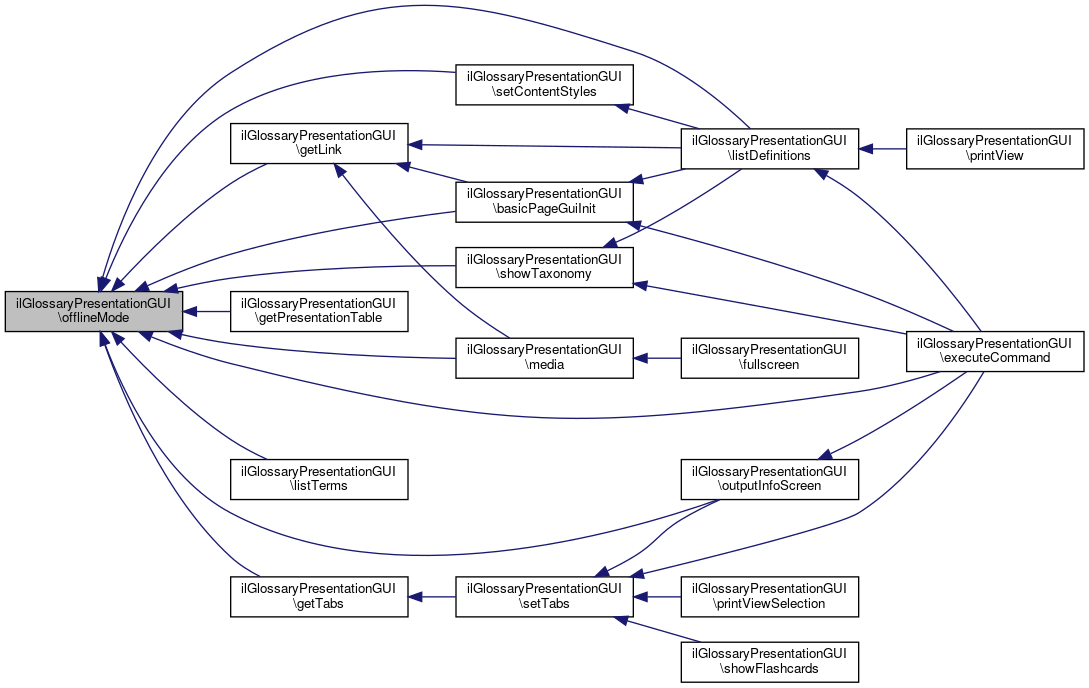 Here is the caller graph for this function:| ilGlossaryPresentationGUI::offlineMode | ( | ) |