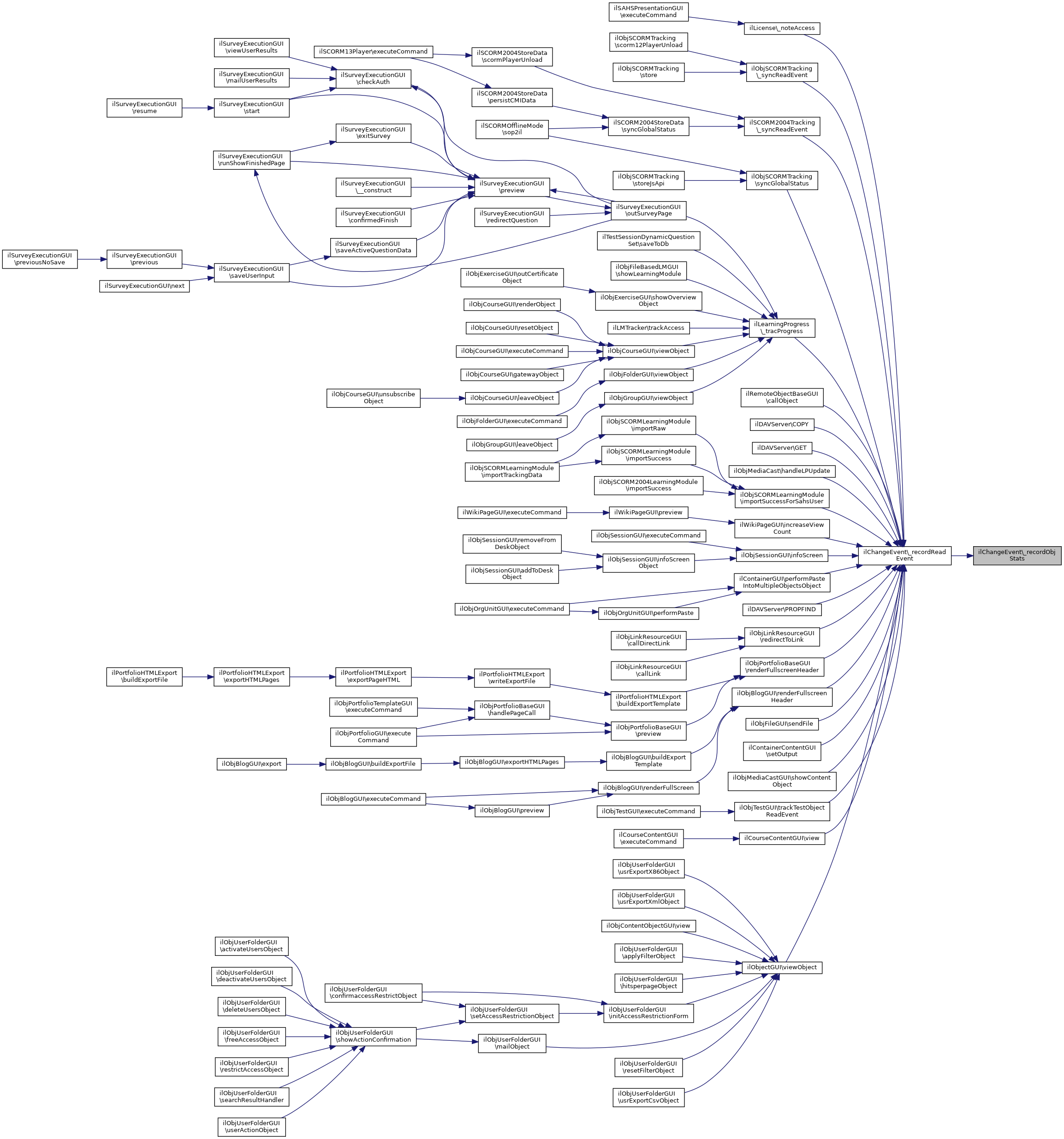 Referenced by ilLicense\_noteAccess(), ilObjSCORMTracking\_syncReadEvent(), ilSCORM2004Tracking\_syncReadEvent(), ilLearningProgress\_tracProgress(), ilRemoteObjectBaseGUI\callObject(), ilDAVServer\COPY(), ilDAVServer\GET(), ilObjMediaCast\handleLPUpdate(), ilObjSCORMLearningModule\importSuccessForSahsUser(), ilWikiPageGUI\increaseViewCount(), ilObjSessionGUI\infoScreen(), ilContainerGUI\performPasteIntoMultipleObjectsObject(), ilDAVServer\PROPFIND(), ilObjLinkResourceGUI\redirectToLink(), ilObjPortfolioBaseGUI\renderFullscreenHeader(), ilObjBlogGUI\renderFullscreenHeader(), ilObjFileGUI\sendFile(), ilContainerContentGUI\setOutput(), ilObjMediaCastGUI\showContentObject(), ilObjSCORMTracking\syncGlobalStatus(), ilObjTestGUI\trackTestObjectReadEvent(), ilCourseContentGUI\view(), and ilObjectGUI\viewObject().