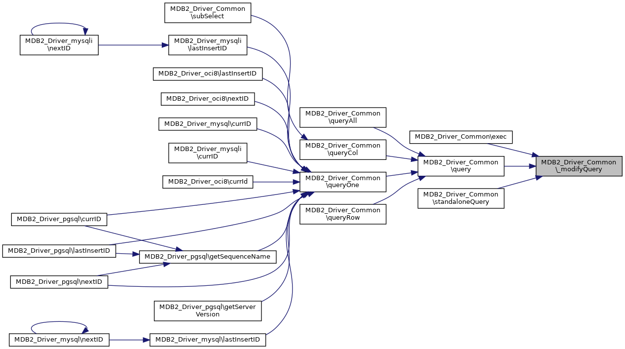 Referenced by MDB2_Driver_pgsql\_modifyManipQuery(), MDB2_Driver_mysql\_modifyQuery(), MDB2_Driver_mysqli\_modifyQuery(), MDB2_Driver_oci8\_modifyQuery(), MDB2_Driver_pgsql\_modifyQuery(), _wrapResult(), exec(), prepare(), MDB2_Driver_mysql\prepare(), MDB2_Driver_mysqli\prepare(), MDB2_Driver_oci8\prepare(), MDB2_Driver_pgsql\prepare(), query(), setLimit(), MDB2_Driver_oci8\standaloneExec(), standaloneQuery(), MDB2_Driver_oci8\standaloneQuery(), and MDB2_Driver_pgsql\standaloneQuery().