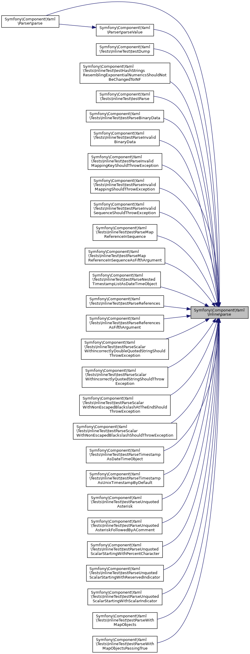Referenced by Symfony\Component\Yaml\Parser\parse(), Symfony\Component\Yaml\Parser\parseValue(), Symfony\Component\Yaml\Tests\InlineTest\testDump(), Symfony\Component\Yaml\Tests\InlineTest\testHashStringsResemblingExponentialNumericsShouldNotBeChangedToINF(), Symfony\Component\Yaml\Tests\InlineTest\testParse(), Symfony\Component\Yaml\Tests\InlineTest\testParseBinaryData(), Symfony\Component\Yaml\Tests\InlineTest\testParseInvalidBinaryData(), Symfony\Component\Yaml\Tests\InlineTest\testParseInvalidMappingKeyShouldThrowException(), Symfony\Component\Yaml\Tests\InlineTest\testParseInvalidMappingShouldThrowException(), Symfony\Component\Yaml\Tests\InlineTest\testParseInvalidSequenceShouldThrowException(), Symfony\Component\Yaml\Tests\InlineTest\testParseMapReferenceInSequence(), Symfony\Component\Yaml\Tests\InlineTest\testParseMapReferenceInSequenceAsFifthArgument(), Symfony\Component\Yaml\Tests\InlineTest\testParseNestedTimestampListAsDateTimeObject(), Symfony\Component\Yaml\Tests\InlineTest\testParseReferences(), Symfony\Component\Yaml\Tests\InlineTest\testParseReferencesAsFifthArgument(), Symfony\Component\Yaml\Tests\InlineTest\testParseScalarWithIncorrectlyDoubleQuotedStringShouldThrowException(), Symfony\Component\Yaml\Tests\InlineTest\testParseScalarWithIncorrectlyQuotedStringShouldThrowException(), Symfony\Component\Yaml\Tests\InlineTest\testParseScalarWithNonEscapedBlackslashAtTheEndShouldThrowException(), Symfony\Component\Yaml\Tests\InlineTest\testParseScalarWithNonEscapedBlackslashShouldThrowException(), Symfony\Component\Yaml\Tests\InlineTest\testParseTimestampAsDateTimeObject(), Symfony\Component\Yaml\Tests\InlineTest\testParseTimestampAsUnixTimestampByDefault(), Symfony\Component\Yaml\Tests\InlineTest\testParseUnquotedAsterisk(), Symfony\Component\Yaml\Tests\InlineTest\testParseUnquotedAsteriskFollowedByAComment(), Symfony\Component\Yaml\Tests\InlineTest\testParseUnquotedScalarStartingWithPercentCharacter(), Symfony\Component\Yaml\Tests\InlineTest\testParseUnquotedScalarStartingWithReservedIndicator(), Symfony\Component\Yaml\Tests\InlineTest\testParseUnquotedScalarStartingWithScalarIndicator(), Symfony\Component\Yaml\Tests\InlineTest\testParseWithMapObjects(), and Symfony\Component\Yaml\Tests\InlineTest\testParseWithMapObjectsPassingTrue().