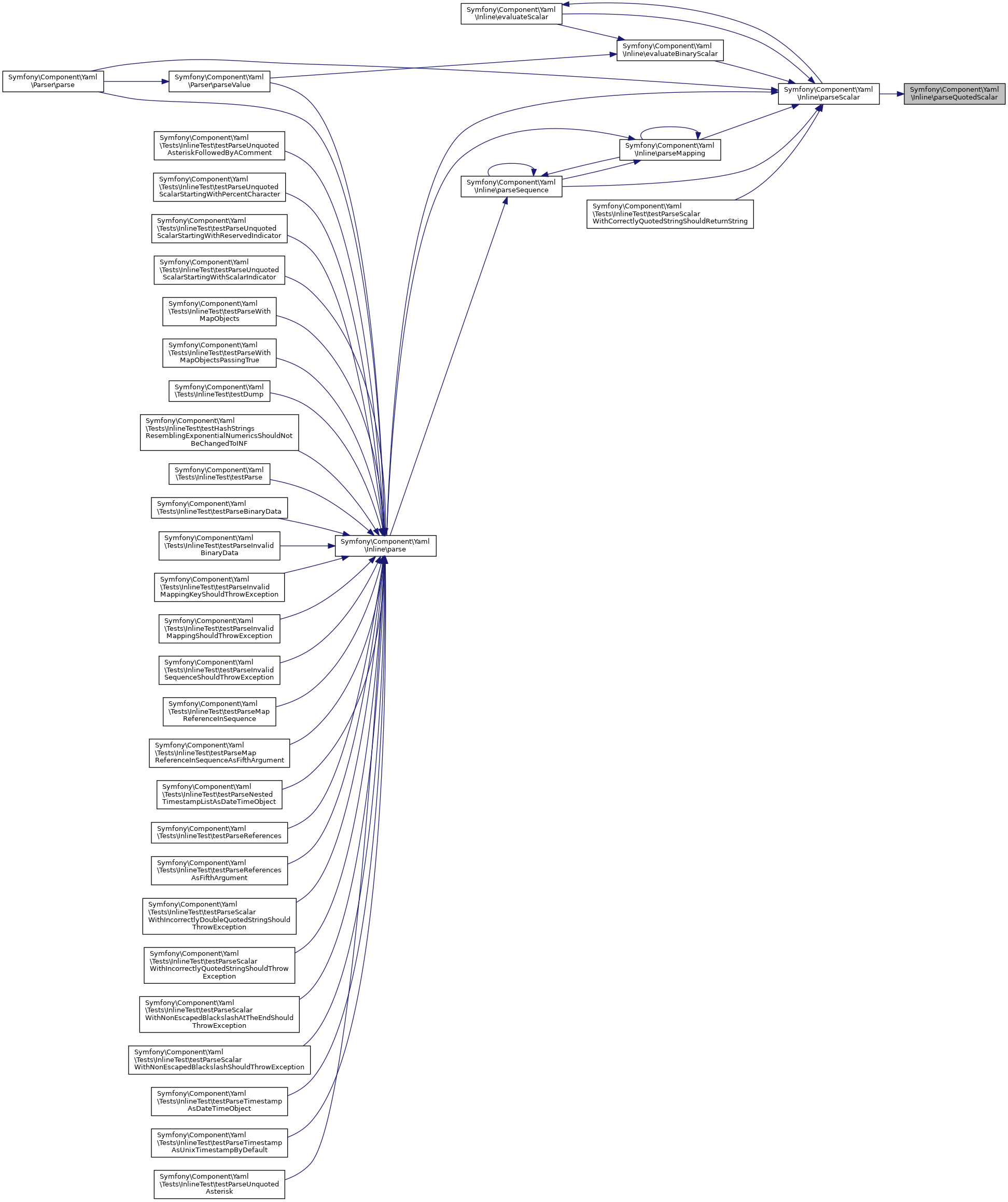 Referenced by Symfony\Component\Yaml\Inline\evaluateBinaryScalar(), Symfony\Component\Yaml\Inline\evaluateScalar(), Symfony\Component\Yaml\Parser\parse(), Symfony\Component\Yaml\Inline\parse(), Symfony\Component\Yaml\Inline\parseMapping(), Symfony\Component\Yaml\Inline\parseSequence(), and Symfony\Component\Yaml\Tests\InlineTest\testParseScalarWithCorrectlyQuotedStringShouldReturnString().