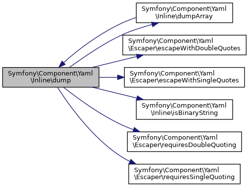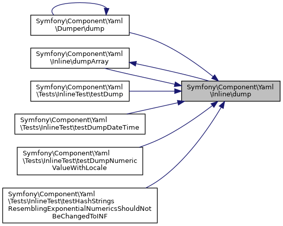 Referenced by Symfony\Component\Yaml\Dumper\dump(), Symfony\Component\Yaml\Inline\dumpArray(), Symfony\Component\Yaml\Tests\InlineTest\testDump(), Symfony\Component\Yaml\Tests\InlineTest\testDumpDateTime(), Symfony\Component\Yaml\Tests\InlineTest\testDumpNumericValueWithLocale(), and Symfony\Component\Yaml\Tests\InlineTest\testHashStringsResemblingExponentialNumericsShouldNotBeChangedToINF().