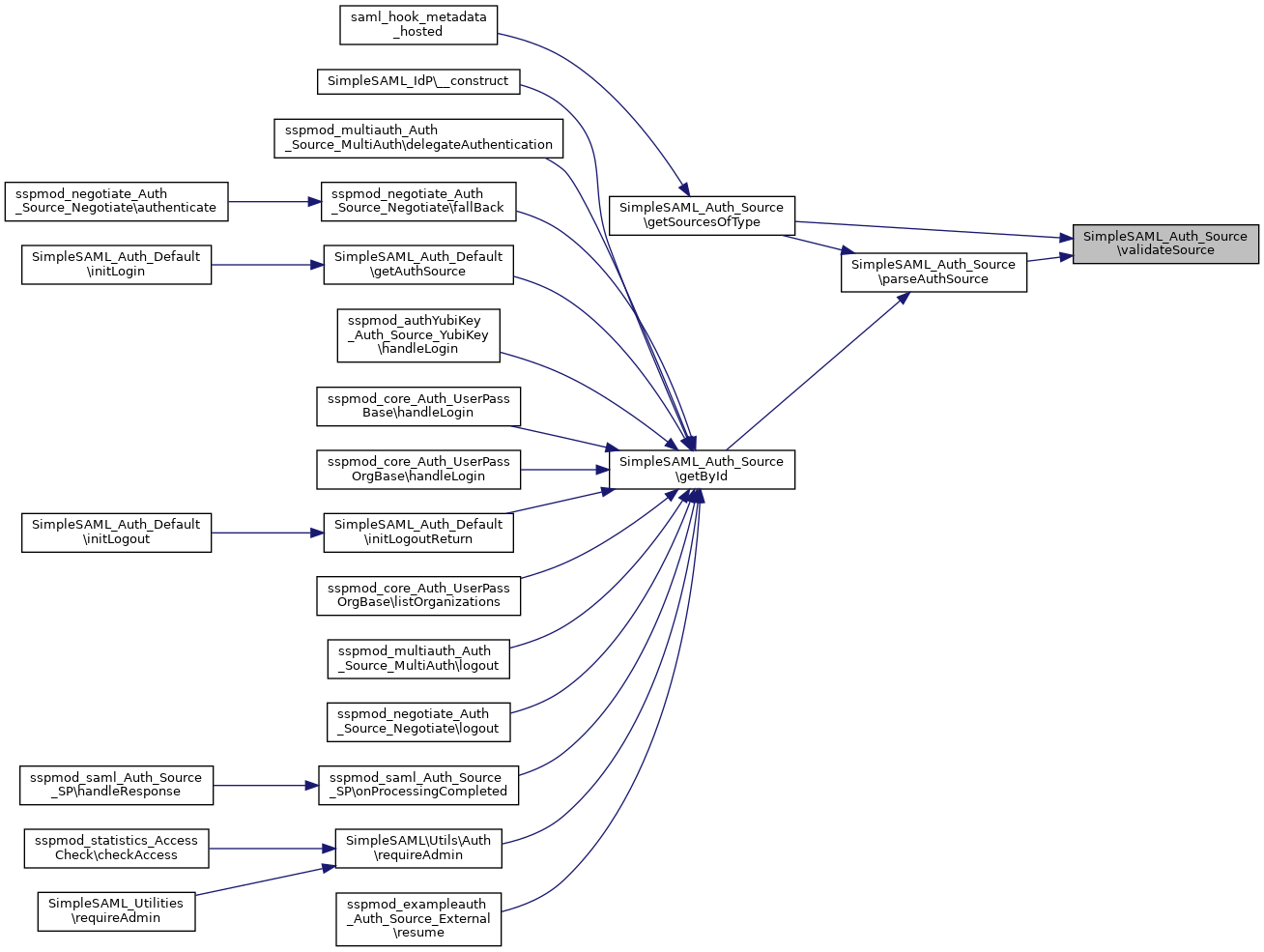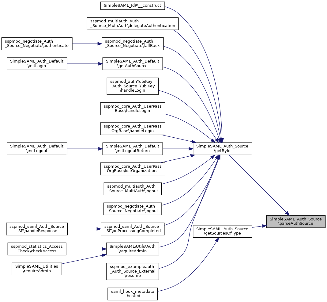 Referenced by SimpleSAML_IdP\__construct(), sspmod_multiauth_Auth_Source_MultiAuth\delegateAuthentication(), sspmod_negotiate_Auth_Source_Negotiate\fallBack(), SimpleSAML_Auth_Default\getAuthSource(), sspmod_authYubiKey_Auth_Source_YubiKey\handleLogin(), sspmod_core_Auth_UserPassBase\handleLogin(), sspmod_core_Auth_UserPassOrgBase\handleLogin(), SimpleSAML_Auth_Default\initLogoutReturn(), sspmod_core_Auth_UserPassOrgBase\listOrganizations(), sspmod_multiauth_Auth_Source_MultiAuth\logout(), sspmod_negotiate_Auth_Source_Negotiate\logout(), sspmod_saml_Auth_Source_SP\onProcessingCompleted(), SimpleSAML\Utils\Auth\requireAdmin(), and sspmod_exampleauth_Auth_Source_External\resume().