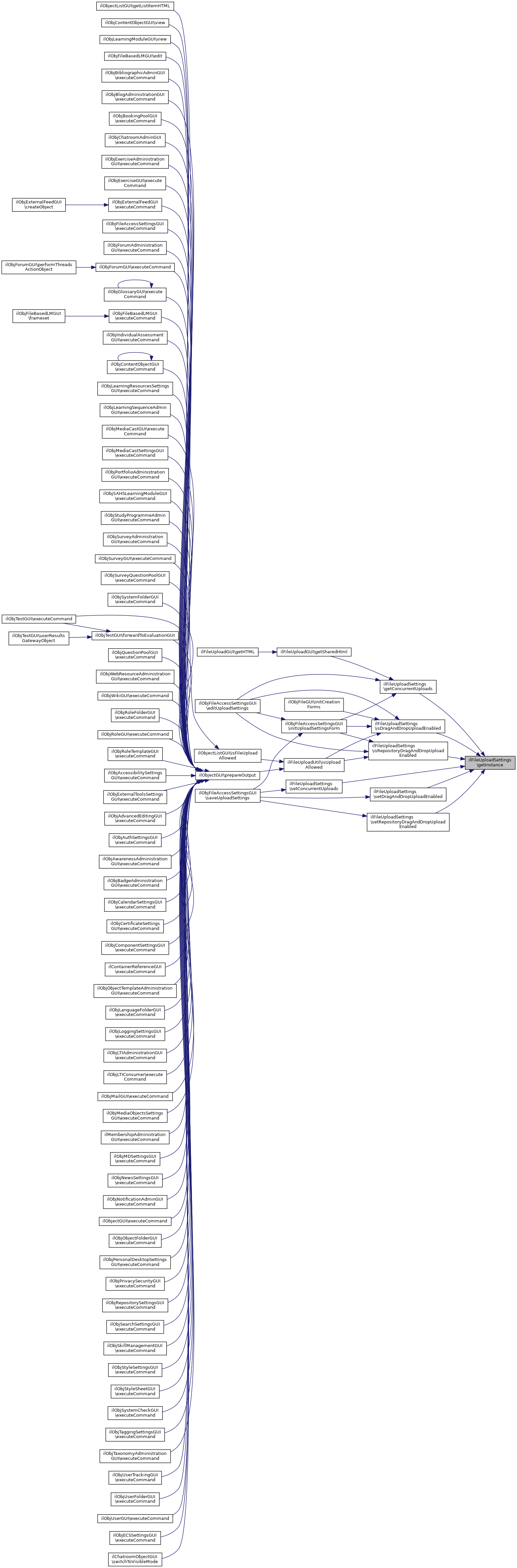 Referenced by ilObjFileAccessSettingsGUI\editUploadSettings(), ilFileUploadGUI\getSharedHtml(), and ilObjFileAccessSettingsGUI\initUploadSettingsForm().