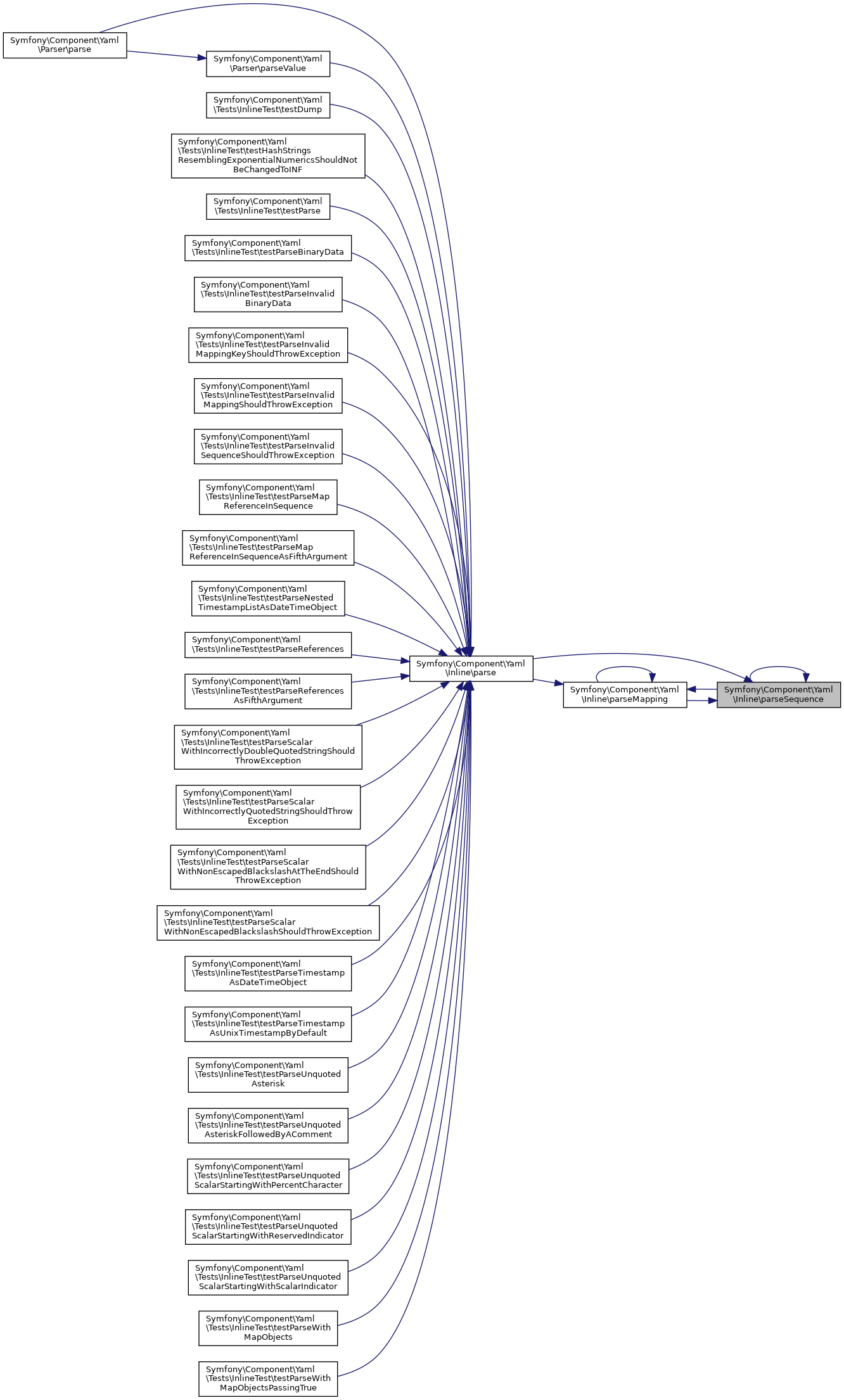 Referenced by Symfony\Component\Yaml\Parser\parse(), Symfony\Component\Yaml\Parser\parseValue(), Symfony\Component\Yaml\Tests\InlineTest\testDump(), Symfony\Component\Yaml\Tests\InlineTest\testHashStringsResemblingExponentialNumericsShouldNotBeChangedToINF(), Symfony\Component\Yaml\Tests\InlineTest\testParse(), Symfony\Component\Yaml\Tests\InlineTest\testParseBinaryData(), Symfony\Component\Yaml\Tests\InlineTest\testParseInvalidBinaryData(), Symfony\Component\Yaml\Tests\InlineTest\testParseInvalidMappingKeyShouldThrowException(), Symfony\Component\Yaml\Tests\InlineTest\testParseInvalidMappingShouldThrowException(), Symfony\Component\Yaml\Tests\InlineTest\testParseInvalidSequenceShouldThrowException(), Symfony\Component\Yaml\Tests\InlineTest\testParseMapReferenceInSequence(), Symfony\Component\Yaml\Tests\InlineTest\testParseMapReferenceInSequenceAsFifthArgument(), Symfony\Component\Yaml\Tests\InlineTest\testParseNestedTimestampListAsDateTimeObject(), Symfony\Component\Yaml\Tests\InlineTest\testParseReferences(), Symfony\Component\Yaml\Tests\InlineTest\testParseReferencesAsFifthArgument(), Symfony\Component\Yaml\Tests\InlineTest\testParseScalarWithIncorrectlyDoubleQuotedStringShouldThrowException(), Symfony\Component\Yaml\Tests\InlineTest\testParseScalarWithIncorrectlyQuotedStringShouldThrowException(), Symfony\Component\Yaml\Tests\InlineTest\testParseScalarWithNonEscapedBlackslashAtTheEndShouldThrowException(), Symfony\Component\Yaml\Tests\InlineTest\testParseScalarWithNonEscapedBlackslashShouldThrowException(), Symfony\Component\Yaml\Tests\InlineTest\testParseTimestampAsDateTimeObject(), Symfony\Component\Yaml\Tests\InlineTest\testParseTimestampAsUnixTimestampByDefault(), Symfony\Component\Yaml\Tests\InlineTest\testParseUnquotedAsterisk(), Symfony\Component\Yaml\Tests\InlineTest\testParseUnquotedAsteriskFollowedByAComment(), Symfony\Component\Yaml\Tests\InlineTest\testParseUnquotedScalarStartingWithPercentCharacter(), Symfony\Component\Yaml\Tests\InlineTest\testParseUnquotedScalarStartingWithReservedIndicator(), Symfony\Component\Yaml\Tests\InlineTest\testParseUnquotedScalarStartingWithScalarIndicator(), Symfony\Component\Yaml\Tests\InlineTest\testParseWithMapObjects(), and Symfony\Component\Yaml\Tests\InlineTest\testParseWithMapObjectsPassingTrue().