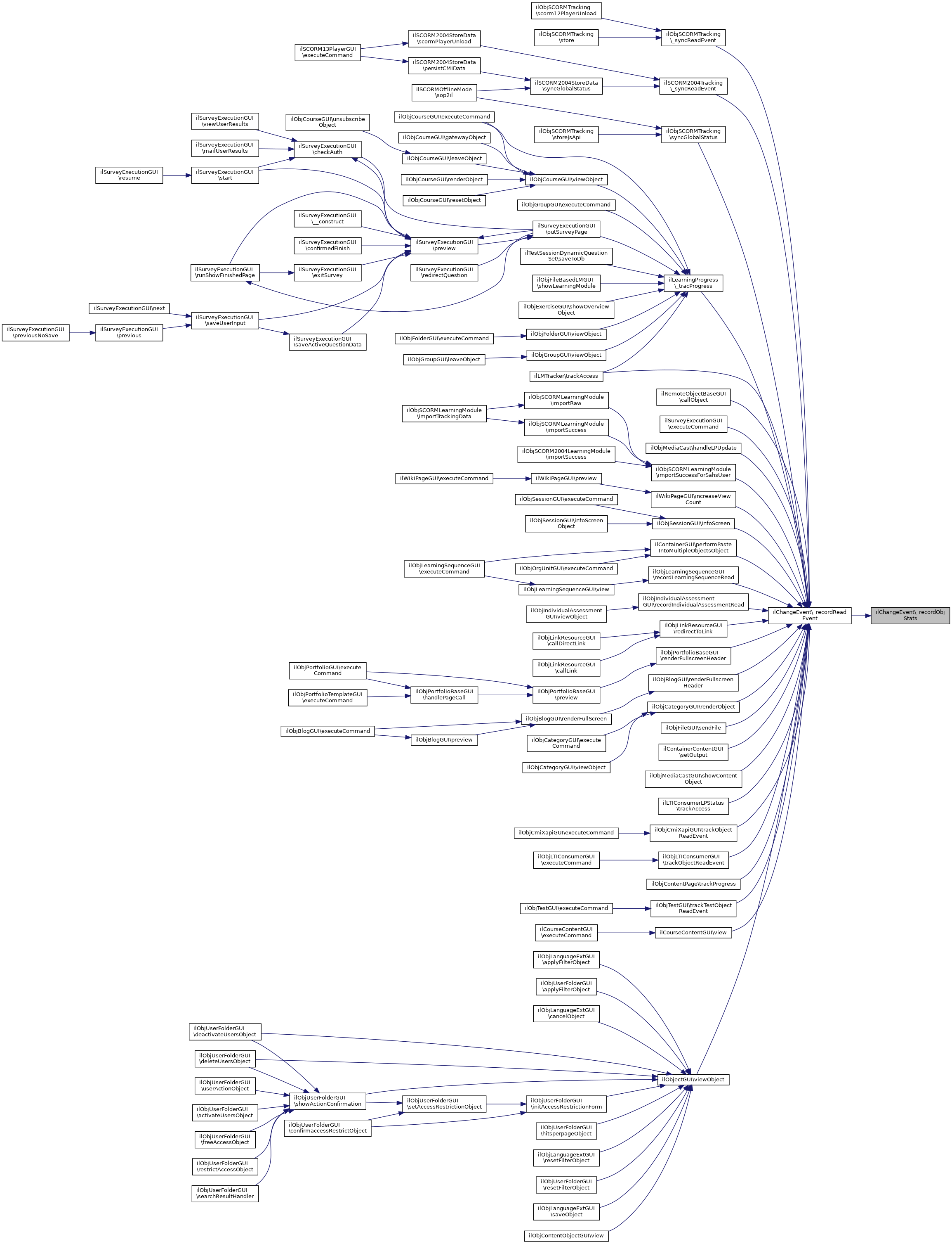 Referenced by ilObjSCORMTracking\_syncReadEvent(), ilSCORM2004Tracking\_syncReadEvent(), ilLearningProgress\_tracProgress(), ilRemoteObjectBaseGUI\callObject(), ilSurveyExecutionGUI\executeCommand(), ilObjMediaCast\handleLPUpdate(), ilObjSCORMLearningModule\importSuccessForSahsUser(), ilWikiPageGUI\increaseViewCount(), ilObjSessionGUI\infoScreen(), ilContainerGUI\performPasteIntoMultipleObjectsObject(), ilObjIndividualAssessmentGUI\recordIndividualAssessmentRead(), ilObjLearningSequenceGUI\recordLearningSequenceRead(), ilObjLinkResourceGUI\redirectToLink(), ilObjPortfolioBaseGUI\renderFullscreenHeader(), ilObjBlogGUI\renderFullscreenHeader(), ilObjCategoryGUI\renderObject(), ilObjFileGUI\sendFile(), ilContainerContentGUI\setOutput(), ilObjMediaCastGUI\showContentObject(), ilObjSCORMTracking\syncGlobalStatus(), ilLMTracker\trackAccess(), ilLTIConsumerLPStatus\trackAccess(), ilObjCmiXapiGUI\trackObjectReadEvent(), ilObjLTIConsumerGUI\trackObjectReadEvent(), ilObjContentPage\trackProgress(), ilObjTestGUI\trackTestObjectReadEvent(), ilCourseContentGUI\view(), and ilObjectGUI\viewObject().