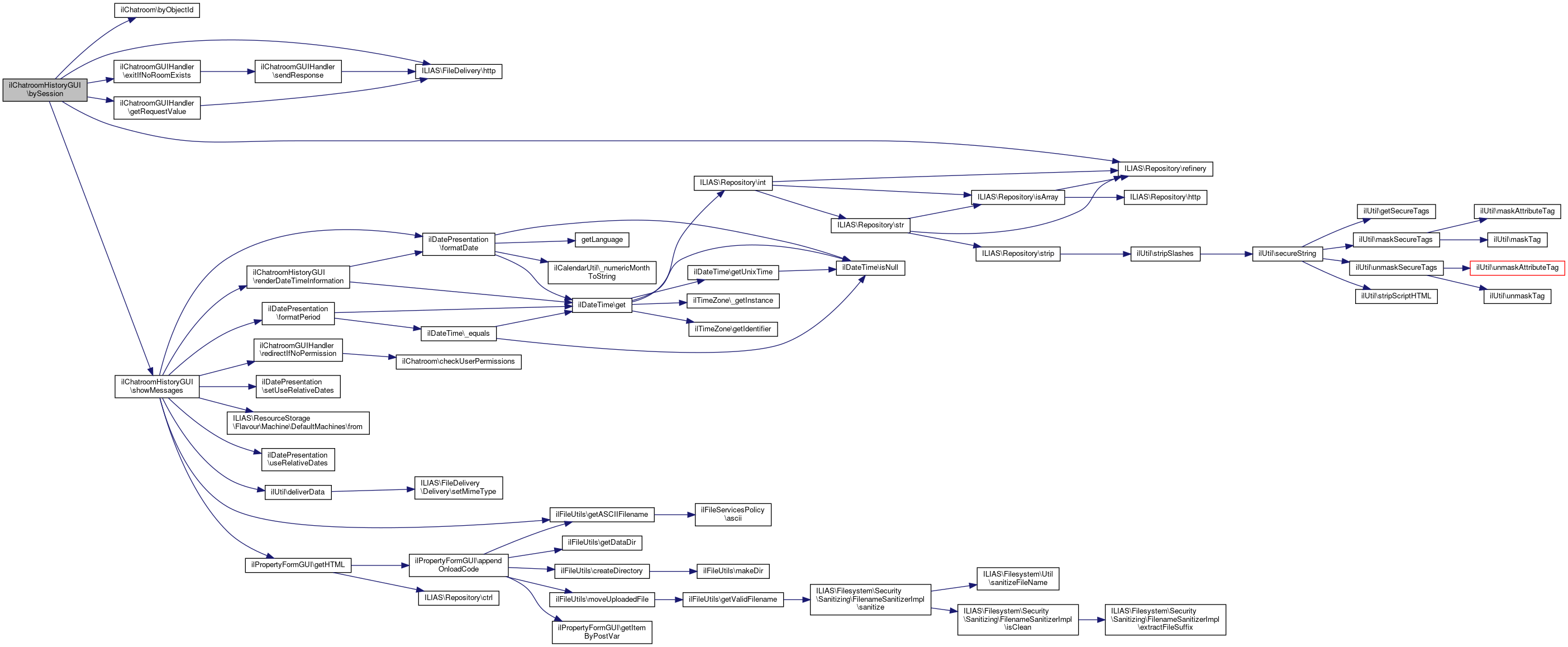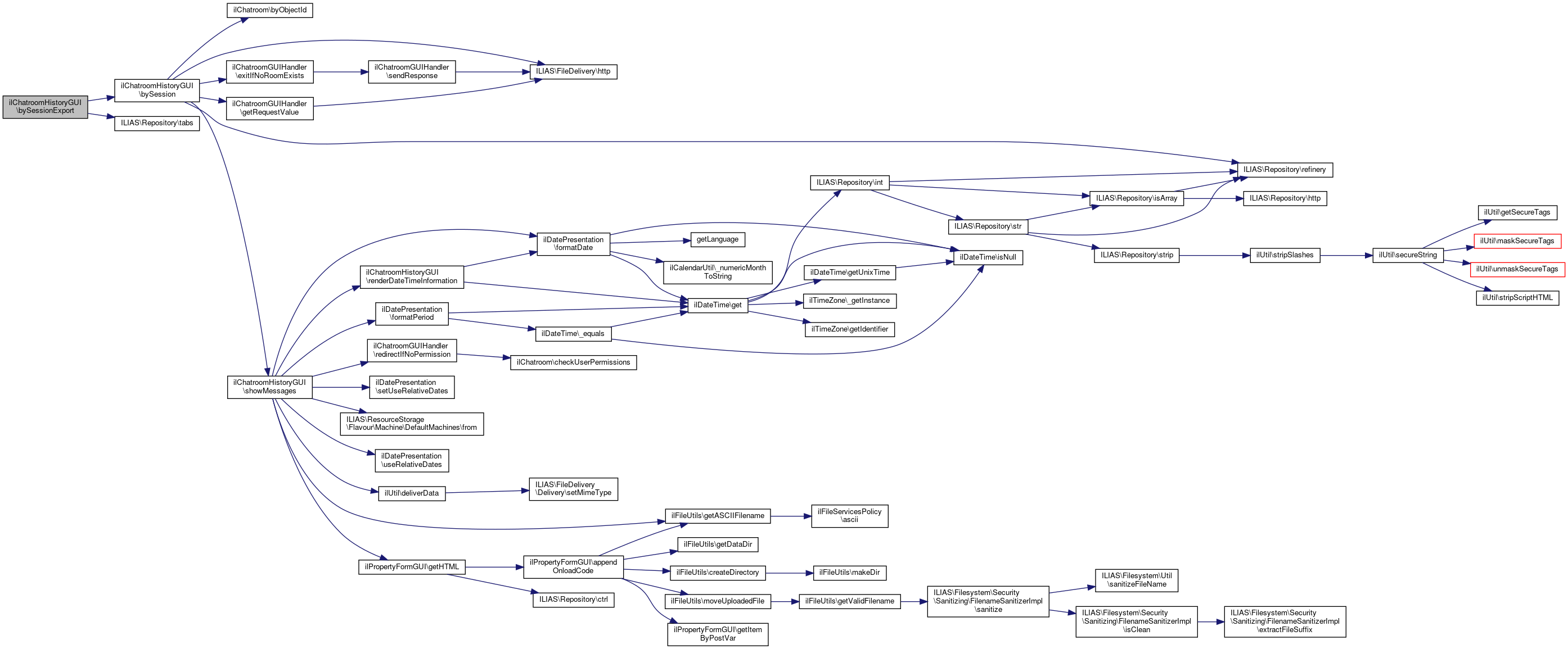 Here is the call graph for this function:| ilChatroomHistoryGUI::bySession | ( | bool | $export = false | ) |