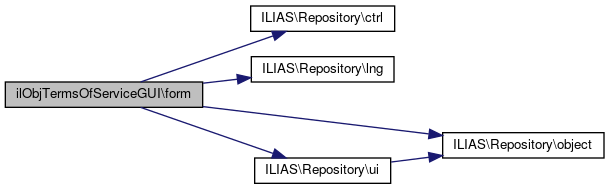 Here is the call graph for this function:| ilObjTermsOfServiceGUI::form | ( | ) |