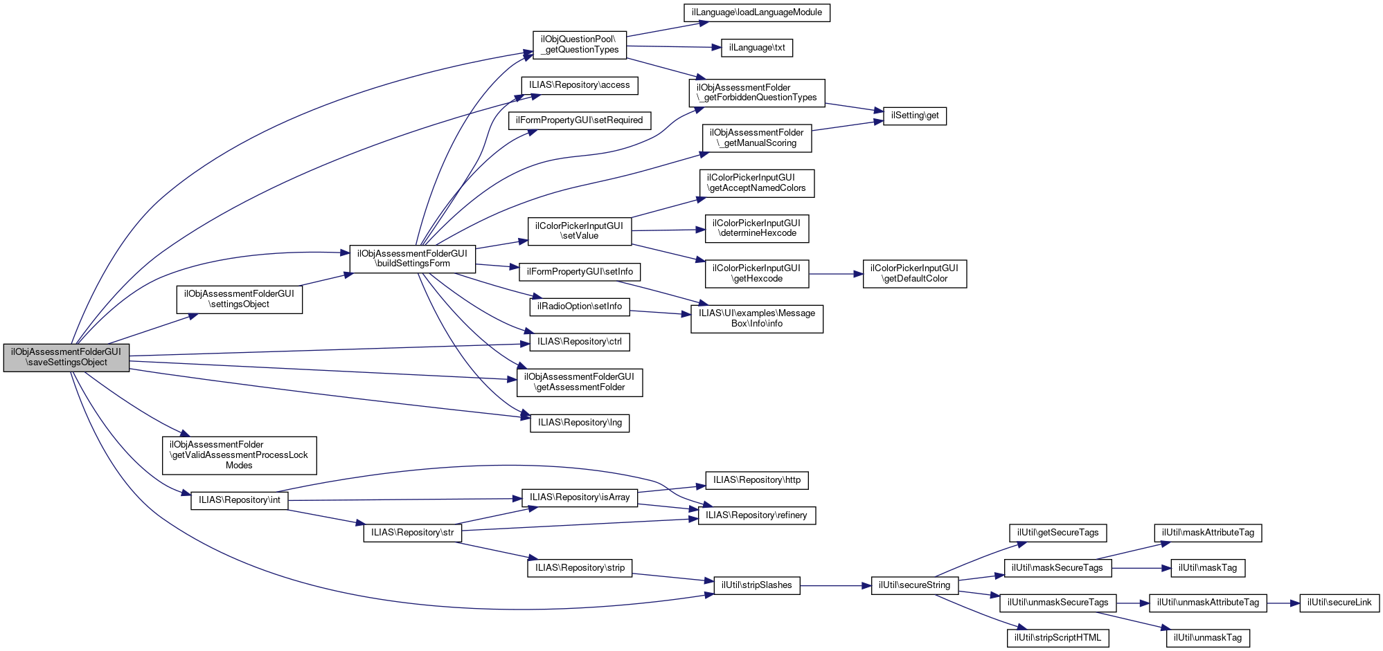 Here is the call graph for this function:| ilObjAssessmentFolderGUI::saveSettingsObject | ( | ) |