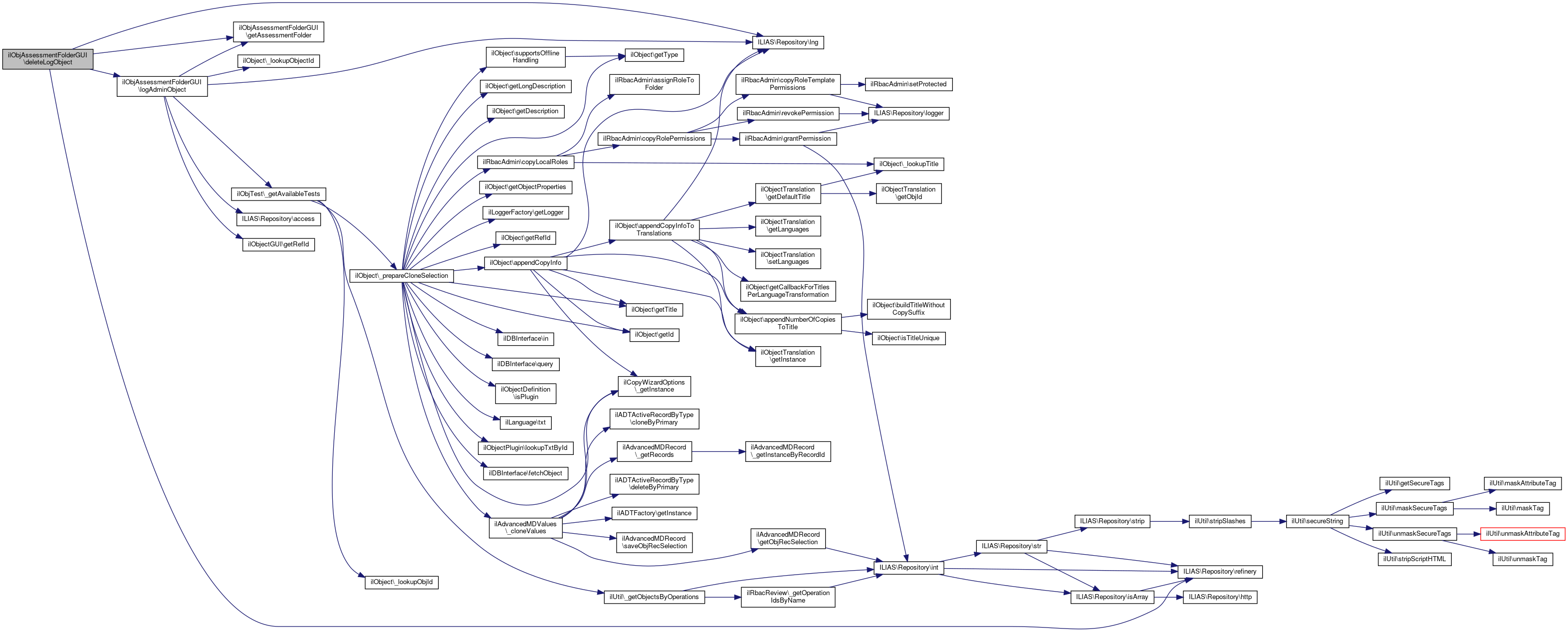 Here is the caller graph for this function:| ilObjAssessmentFolderGUI::deleteLogObject | ( | ) |