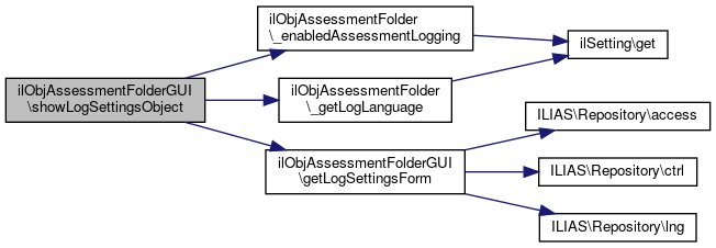 References ILIAS\Repository\access(), getAssessmentFolder(), getLogSettingsForm(), ILIAS\Repository\lng(), and showLogSettingsObject().