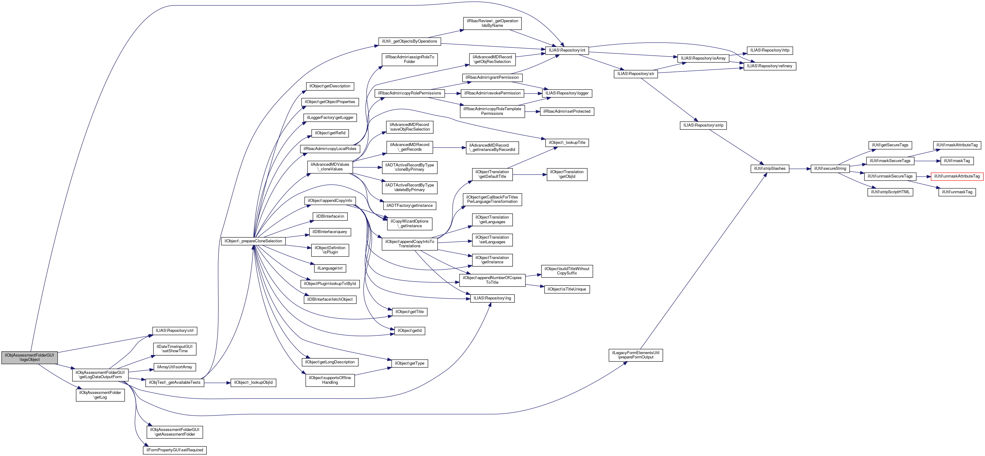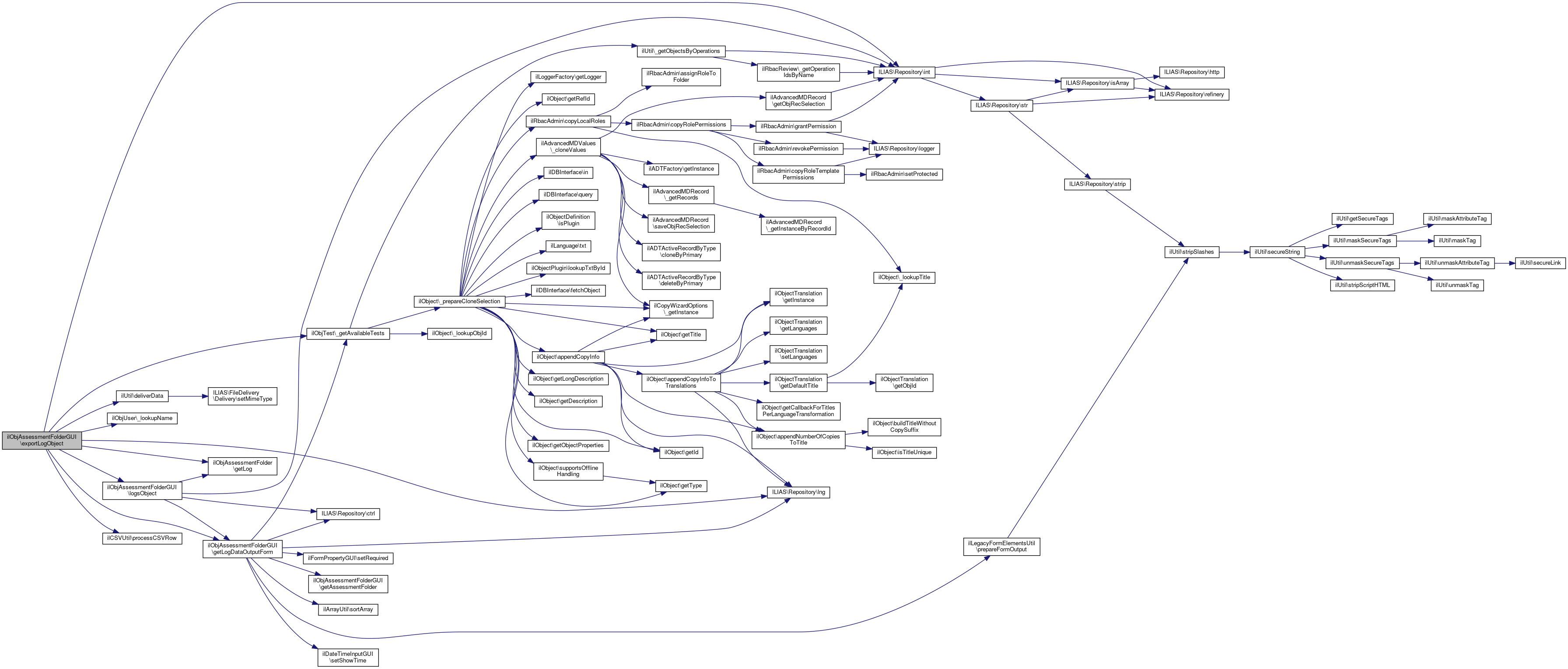 Here is the call graph for this function:| ilObjAssessmentFolderGUI::exportLogObject | ( | ) |