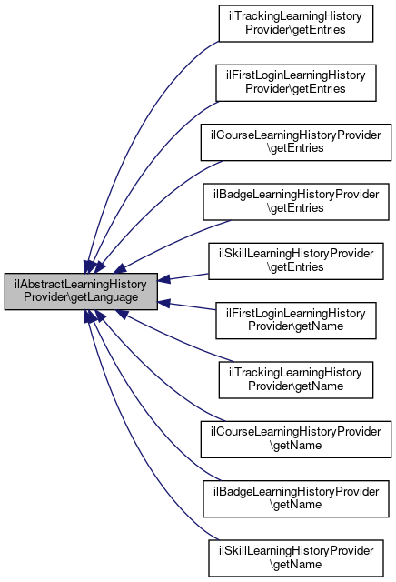 Referenced by __construct(), ilTrackingLearningHistoryProvider\getEntries(), ilFirstLoginLearningHistoryProvider\getEntries(), ilCourseLearningHistoryProvider\getEntries(), ilBadgeLearningHistoryProvider\getEntries(), ilSkillLearningHistoryProvider\getEntries(), getLanguage(), ilFirstLoginLearningHistoryProvider\getName(), ilTrackingLearningHistoryProvider\getName(), ilCourseLearningHistoryProvider\getName(), ilBadgeLearningHistoryProvider\getName(), and ilSkillLearningHistoryProvider\getName().