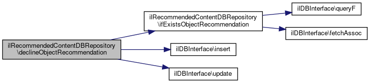 Here is the call graph for this function:| ilRecommendedContentDBRepository::declineObjectRecommendation | ( | int | $user_id, |