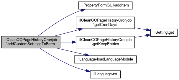 Here is the call graph for this function:| ilCleanCOPageHistoryCronjob::addCustomSettingsToForm | ( | ilPropertyFormGUI | $a_form | ) |
