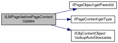 Here is the call graph for this function:| ilLMPage::beforePageContentUpdate | ( | ilPageContent | $a_page_content | ) |