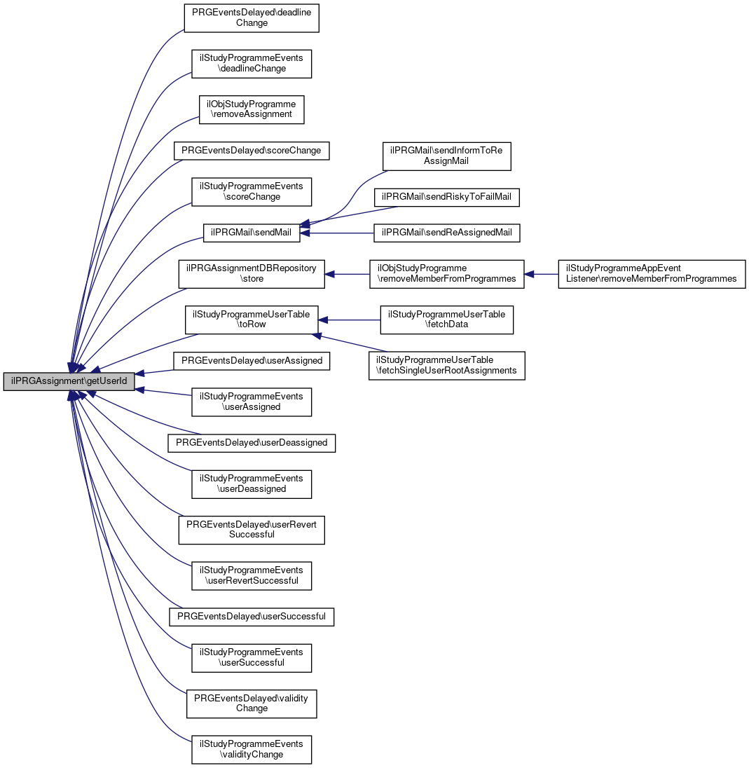 Referenced by PRGEventsDelayed\deadlineChange(), ilStudyProgrammeEvents\deadlineChange(), PRGEventsDelayed\informUserByMailToRestart(), ilStudyProgrammeEvents\informUserByMailToRestart(), ilObjStudyProgramme\removeAssignment(), ilPRGAssignmentDBRepository\resetExpiryInfoSentFor(), ilPRGAssignmentDBRepository\resetRiskyToFailSentFor(), PRGEventsDelayed\scoreChange(), ilStudyProgrammeEvents\scoreChange(), ilPRGMail\sendMail(), ilPRGAssignmentDBRepository\store(), ilPRGAssignmentDBRepository\storeExpiryInfoSentFor(), ilPRGAssignmentDBRepository\storeRiskyToFailSentFor(), ilStudyProgrammeUserTable\toRow(), PRGEventsDelayed\userAssigned(), ilStudyProgrammeEvents\userAssigned(), PRGEventsDelayed\userDeassigned(), ilStudyProgrammeEvents\userDeassigned(), PRGEventsDelayed\userReAssigned(), ilStudyProgrammeEvents\userReAssigned(), PRGEventsDelayed\userRevertSuccessful(), ilStudyProgrammeEvents\userRevertSuccessful(), PRGEventsDelayed\userRiskyToFail(), ilStudyProgrammeEvents\userRiskyToFail(), PRGEventsDelayed\userSuccessful(), ilStudyProgrammeEvents\userSuccessful(), PRGEventsDelayed\validityChange(), and ilStudyProgrammeEvents\validityChange().