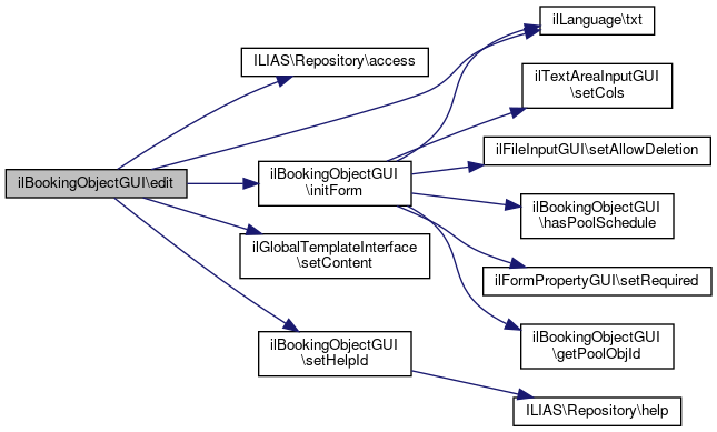 Here is the call graph for this function:| ilBookingObjectGUI::edit | ( | ilPropertyFormGUI | $a_form = null | ) |