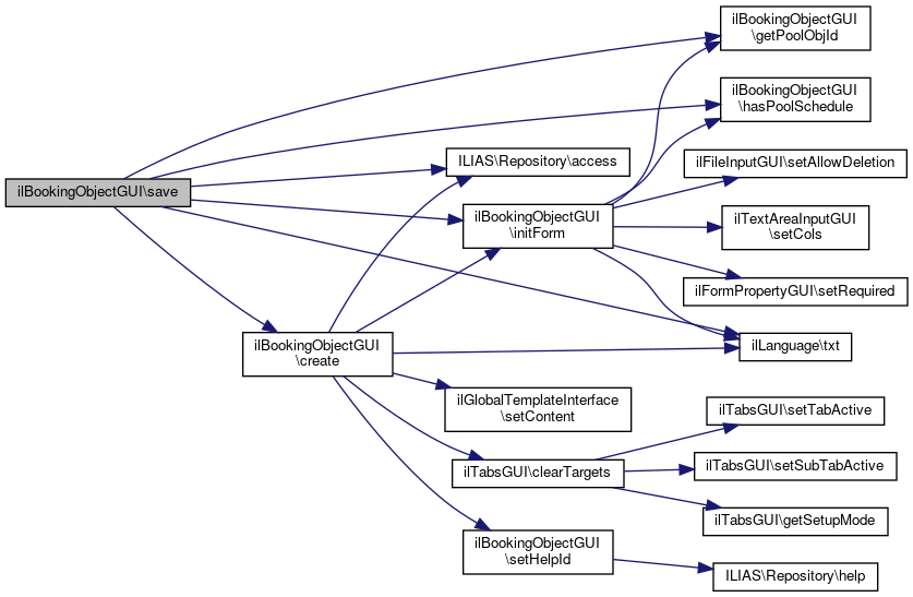 Here is the call graph for this function:| ilBookingObjectGUI::save | ( | ) |