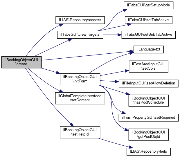 Here is the call graph for this function:| ilBookingObjectGUI::create | ( | ilPropertyFormGUI | $a_form = null | ) |