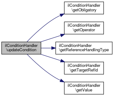 Here is the call graph for this function:| ilConditionHandler::updateCondition | ( | int | $a_id | ) |