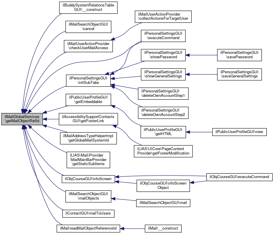 Referenced by ilBuddySystemRelationsTableGUI\__construct(), ilMailSearchObjectGUI\cancel(), ilMailUserActionProvider\checkUserMailAccess(), ilPersonalSettingsGUI\executeCommand(), ilPublicUserProfileGUI\getEmbeddable(), ilAccessibilitySupportContactsGUI\getFooterLink(), ilMailAddressTypeHelperImpl\getGlobalMailSystemId(), ILIAS\Mail\Provider\MailMainBarProvider\getStaticSubItems(), ilObjCourseGUI\infoScreen(), ilPersonalSettingsGUI\initSubTabs(), ilMailSearchObjectGUI\mailObjects(), ilContactGUI\mailToUsers(), and ilMail\readMailObjectReferenceId().