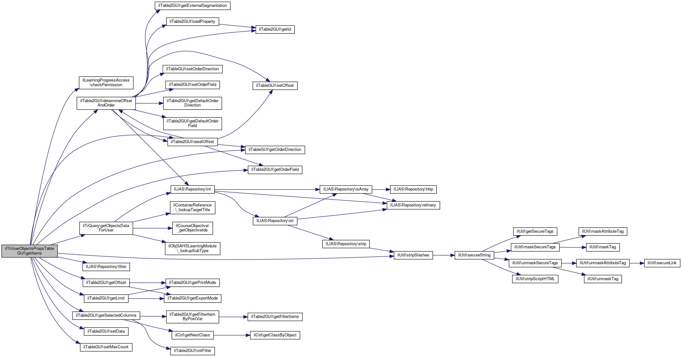 Here is the call graph for this function:| ilTrUserObjectsPropsTableGUI::getItems | ( | ) |