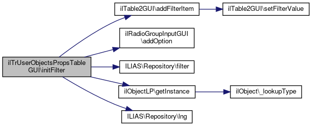Here is the caller graph for this function:| ilTrUserObjectsPropsTableGUI::initFilter | ( | ) |