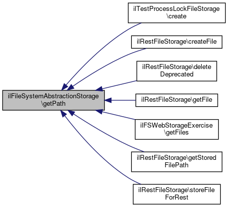 Here is the call graph for this function:| ilFileSystemAbstractionStorage::getPath | ( | ) |