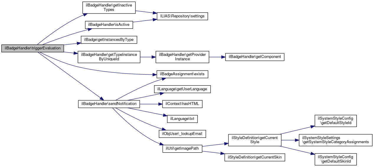 Here is the call graph for this function:| ilBadgeHandler::triggerEvaluation | ( | string | $a_type_id, |