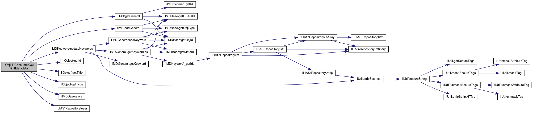 Here is the call graph for this function:| ilObjLTIConsumerGUI::initMetadata | ( | \ilObject | $object | ) |
