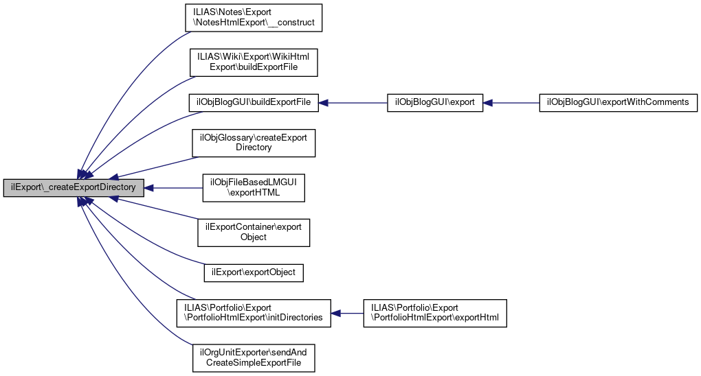 Referenced by ILIAS\Notes\Export\NotesHtmlExport\__construct(), _createExportDirectory(), _getExportFiles(), ilExportContainer\addSubitems(), ILIAS\Wiki\Export\WikiHtmlExport\buildExportFile(), ilObjBlogGUI\buildExportFile(), ilExportGUI\delete(), ilExportGUI\download(), ilSAHSEditGUI\executeCommand(), ilObjFileBasedLMGUI\exportHTML(), ilExportContainer\exportObject(), exportObject(), ilObjUser\exportPersonalData(), ilDclContentExporter\getExportContentPath(), ilObjGlossary\getExportDirectory(), ilObjQuestionPool\getExportDirectory(), ilDclExportTableGUI\getExportFiles(), ilQuestionPoolExportTableGUI\getExportFiles(), ilScormAiccDataSet\getExtendedXmlRepresentation(), ilObjUser\getPersonalDataExportFile(), ILIAS\Wiki\Export\WikiHtmlExport\getUserExportFile(), ILIAS\Portfolio\Export\PortfolioHtmlExport\init(), ilOrgUnitExporter\sendAndCreateSimpleExportFile(), ilObjUser\sendPersonalDataFile(), ILIAS\Notes\Export\NotesHtmlExport\zipPackage(), ILIAS\Blog\Export\BlogHtmlExport\zipPackage(), and ILIAS\Portfolio\Export\PortfolioHtmlExport\zipPackage().
