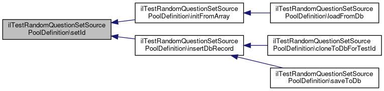 Here is the call graph for this function:| ilTestRandomQuestionSetSourcePoolDefinition::setId | ( | int | $id | ) |